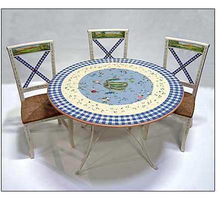 Table painted in Sapphire White with Gingham Blue Gingham and pastoral scene with fruit and flowers. Chairs (F0470) painted in Sapphire White with Gingham Blue Gingham and coordinating pastoral scenes on each chair.