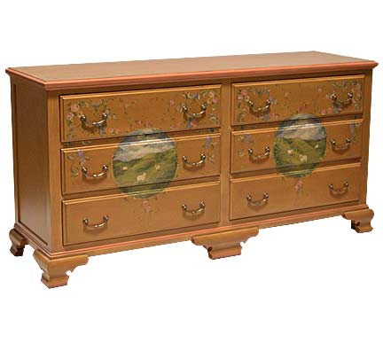 Shown in Pickled Pine Finish with accents of Shrimp, Medallions with Pastoral scenes, and florals with filigree.