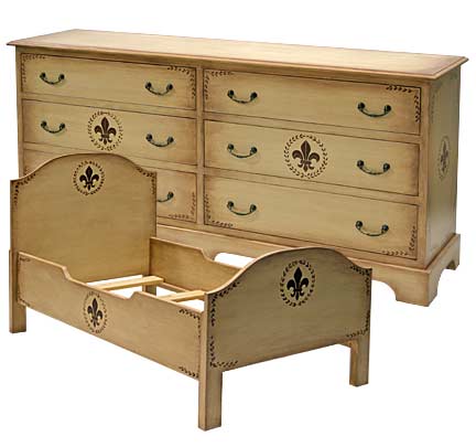 Painted in Aged Vanilla Cream Finish with custom Fleur de Lys design