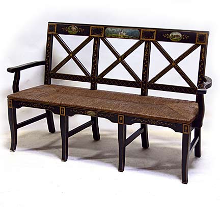 Black with Antique Gold filigree crosshatching and leaves and vines. Oval center medallion features historical view of U. S. Capitol. Oval side medallions feature historical views of Mt. Vernon and Monticello. Center oval medallion on apron features historical view of the White House.