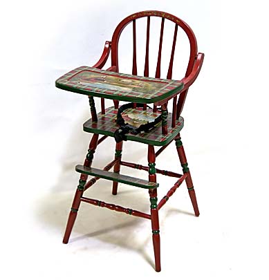 Shown in Cherry Red with Stewart Plaid on the seat and and tray and accents of Liner Green. Design features Farm Scene FM-04 on seat of Highchair and Farm Scene FM-06 on tray of Highchair.