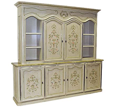 Shown in Light Gray Green with accents of Charcoal and Moss lining. Filigree with leaf and berry detail. Entertainment Center includes center section to accommodate a flat screen television with bookcases on either side and storage in lower cabinets. |