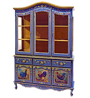 Shown in French Blue with accents of Provence Gold and Chocolate. Doors painted with rooster medallions, leaves and vine and sunflowers.
