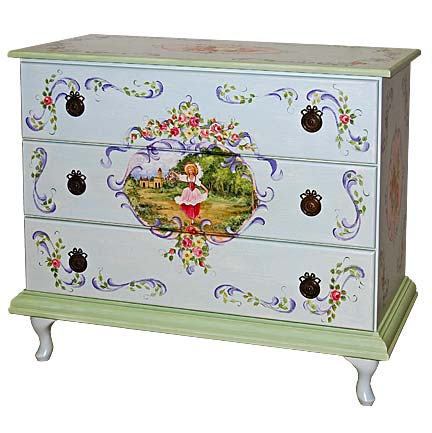 F0910 Three Drawer Chest painted in Pale Blue with accents of Snow White and Beatrice Green. Chest features TL-33 with filigree, crosshatching and florals.