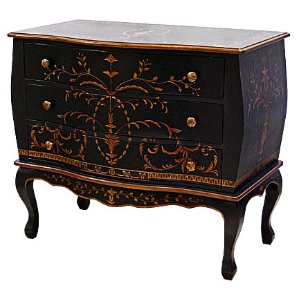 Shown in Lamp Black with aged gold accents, Chest features Classical design