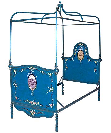 Painted in special Aged Blue finish with oval medallions featuring monogram and Castle and Pastoral Scene C-03 in Plum Smoke Toile. Design features floral swags with Violet ribbons and leaves and vines on the canopy.