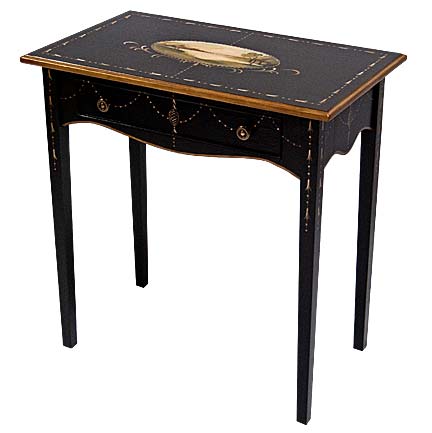 Shown in Lamp Black with accents of Old Gold. Table features oval medallion with Low Country scene. Laurel leaves with classical swag.