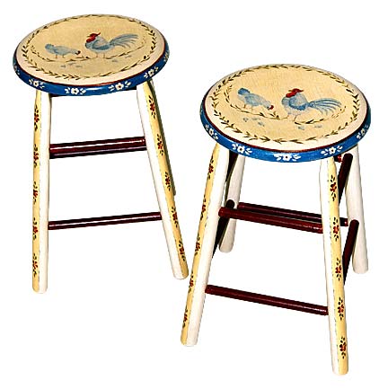 Painted in White accents of Flame and Gingham Blue. Stool features rooster and hen with chicks on Light Yellow Ground. Gingham Blue border with stylized flowers. Flame detail on legs features stylized flowers.