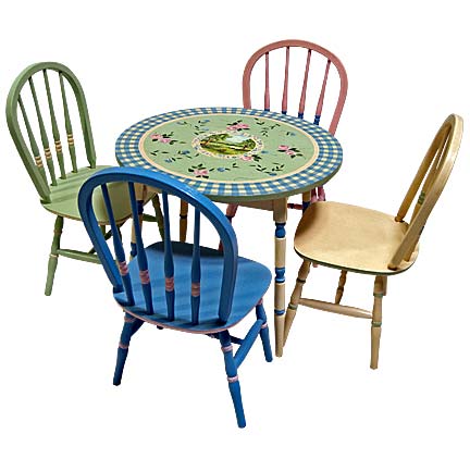Table: Painted in Cream with border of Daphne Gingham and accents of Pistachio and Petal Pink. Table top is painted with P-02 Pastoral scene surrounded by flowers. Chairs: Painted in Petal Pink with accents of Daphne; Daphne with accents of Petal Pink; Pistachio with accents of Cream and Cream with accents of Pistachio.