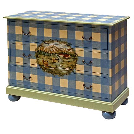 Painted in Vanilla with Daphne Gingham and accents of Pistachio. Center front of chest features A -32 medallion outlined with pine boughs.
