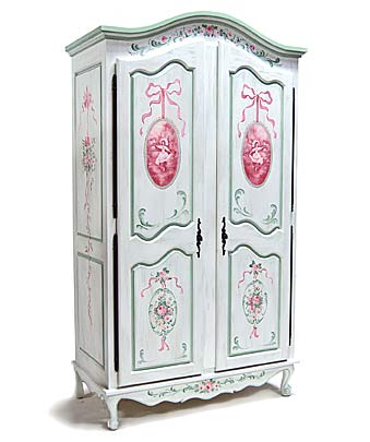 Shown in Sapphire White Wax Super White with accents of Pistachio. Oval Toile medallions suspended from Petal Pink ribbons on upper doors. Venetians with florals painted in shades of Pistachio and Petal Pink. Coordinating floral bouquets suspended from ribbons on side panels. Interior features 3 adjustable shelves. |