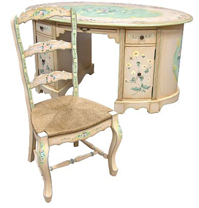 Oval Desk shown in Almond with Brown Clay aging and Pistachio accents; Chair in Almond with Pistachio & Larkspur accents; Both adorned with mixed florals and filigree
