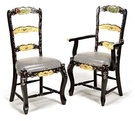 Shown in Lamp Black with Taffy. Painted with Farm scenes, filigree, florals and crosshatching. COM upholstery.