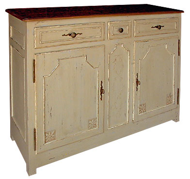 Charcoal Wax Periwinkle Wax Smokey with aged, rubbed walnut top. Vine and leaf detail. Aged iron hardware.