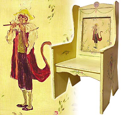 Eggplant Wax Cream with musical monkey, flowers, laurel swags and a toile medallion on upper chair back. Perfect as a pair of host chairs in an informal dining area.