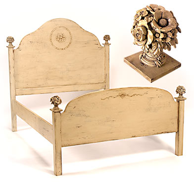 Roasted chestnut wax beige with floral design and new flower basket finials.