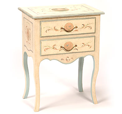 Antique white finish w/ accents of French Gray Blue & Charcoal. Filigree and medallions of landscapes. Antique brass hardware.