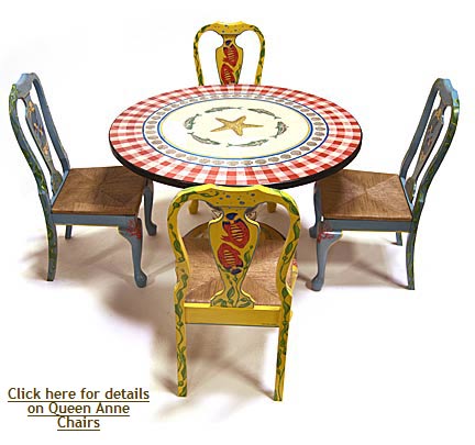 Chairs are painted in Hot Yellow and Sea Blue with fish detail and accents of Seaweed, Scallop Shells, and Coral. |