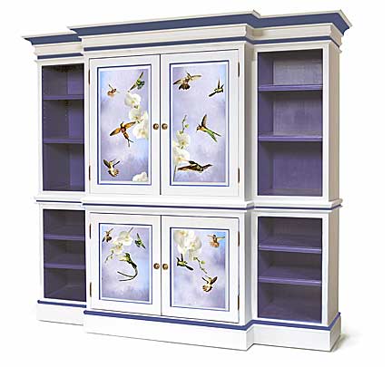 Shown in Titanium White with custom Delphinium Blue interior and accents. Door panels feature phalaenopsis orchids with exotic hummingbirds in flight.