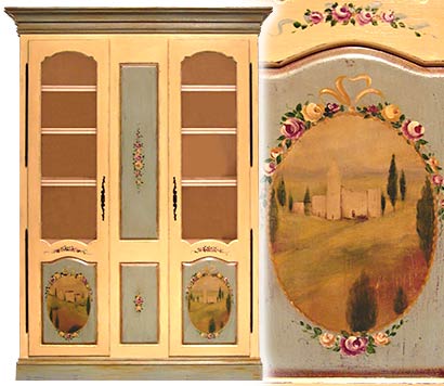 Charcoal wax Cream with interior painted in Blush. Doors with glass panels painted with Tuscan scenes, florals and accents of French Gray Blue. Aged iron hardware.