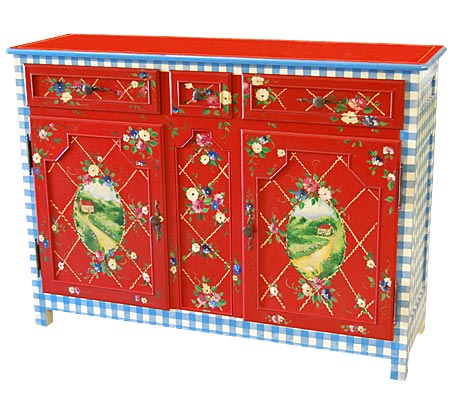 Shown in Cherry Red with Custom Blue and White Gingham. Floral Trellis with Tuscan Scene.