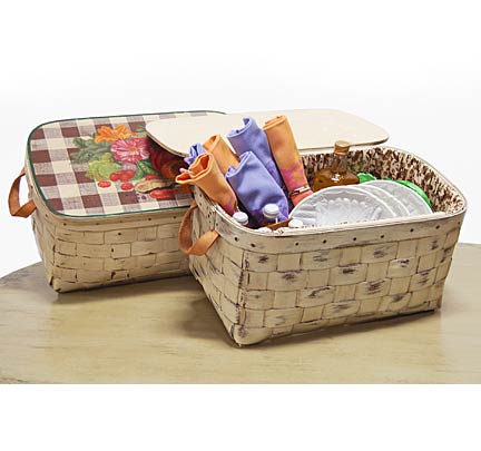 Shown in Aged White with Chocolate Gingham with accents of Liner Green featuring a still life of flowers, fruit, vegetables, and crawfish.