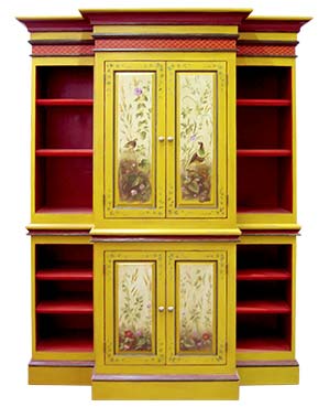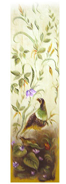 Shown in Charcoal wax Mustard with a Flame interior and accents of Liner Red, Liner Green and Black. Pheasants, wildflowers and crosshatching complete the design.