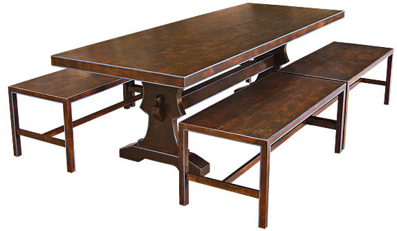 Umbrian Table shown and custom benches shown in Mahogany finish with Meadow Blue lining.